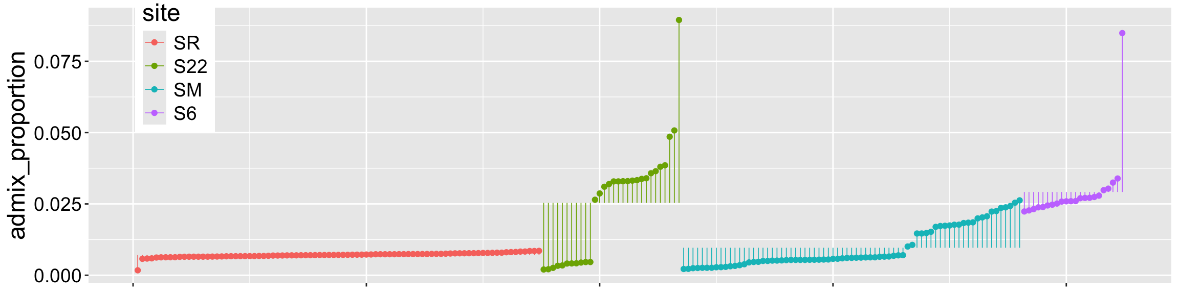Here SR is the “reference level”, and as such, SR’s mean admixture proportion equals the intercept, 0.0071. Similarly, we estimate an admixture proportion of 0.0183 + 0.0071 = 0.0254 at site S22.