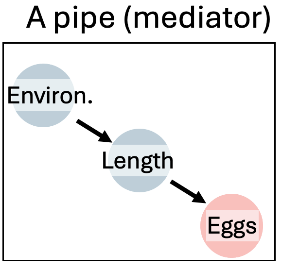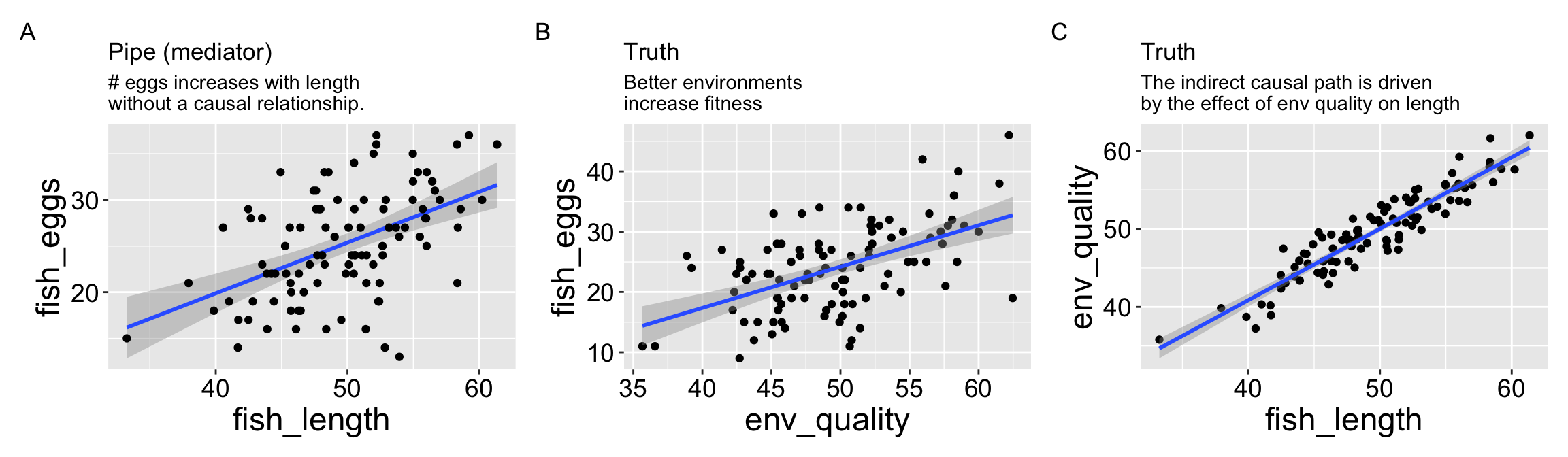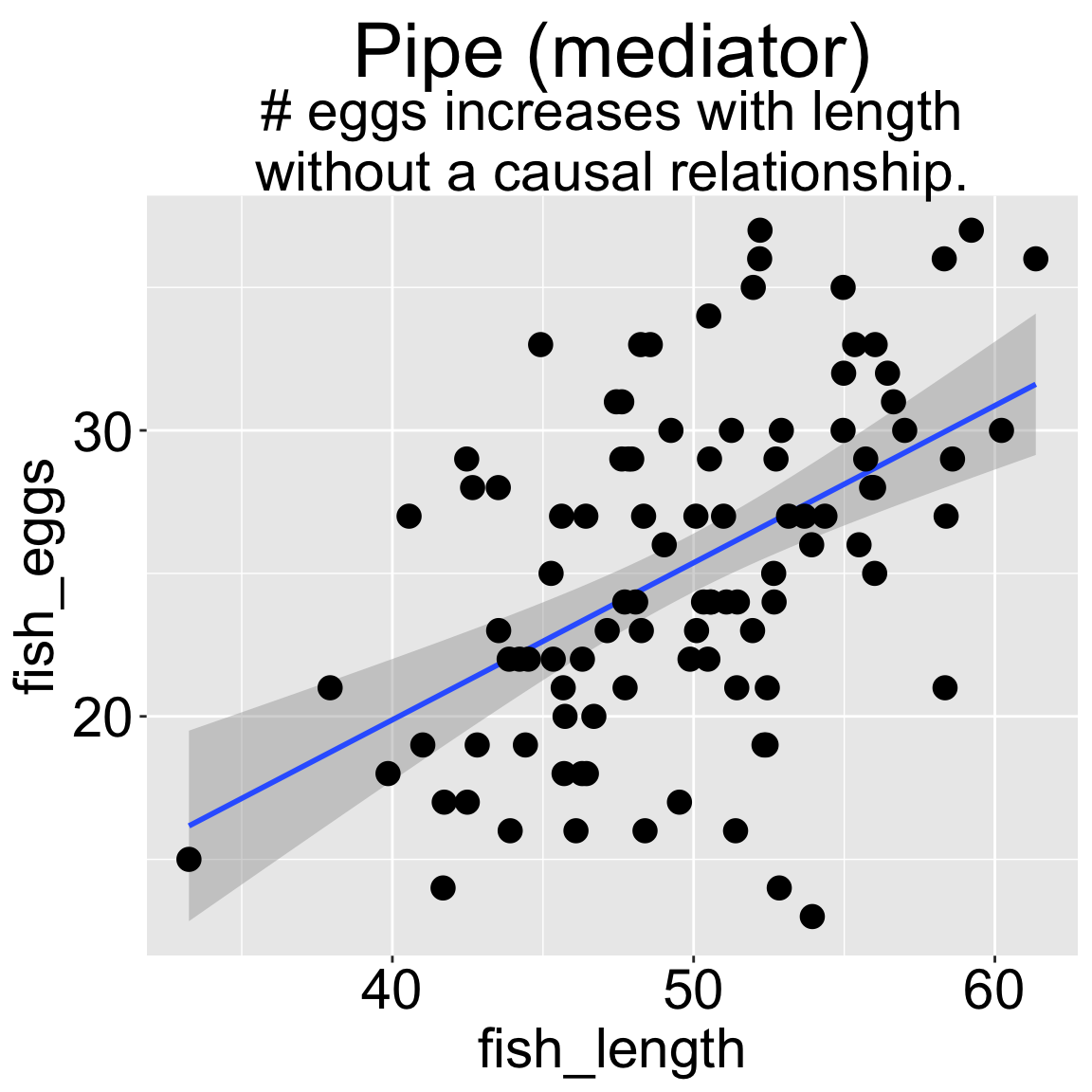 Thinking about cause: In a real way you could say that environmental quality was a cause here. If we did an experiment and changed environmental quality we would get more eggs. Of course, we would get more eggs because fish length increased with environmental quality and this increase in length would be the cause of more eggs. If we could somehow increase fish length other means (e.g., selective breeding) without improving environmental quality, or if environmental quality improved but length remained constant, we would not – according to this DAG – see an increase in egg numbers.