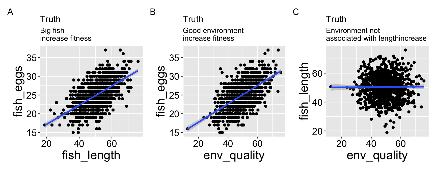Let’s begin with a simple confound. Here a good environment leads to larger fish and increased fitness (more eggs), but size itself has no direct effect on fitness. Here’s how we’ll set up the simulation: