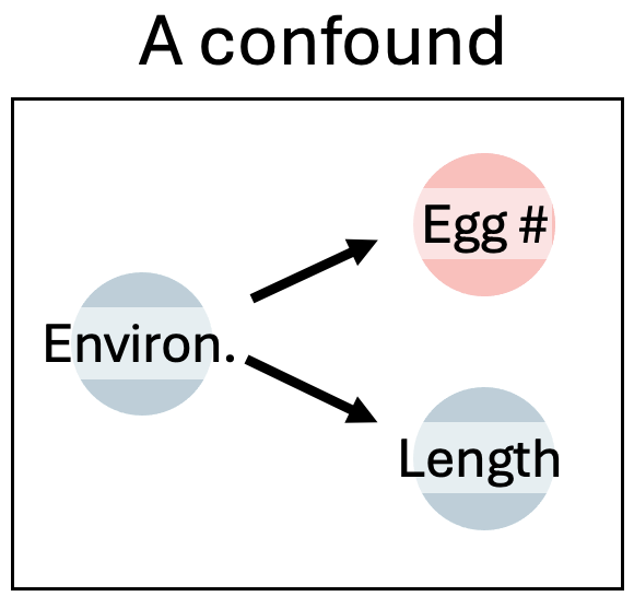 The results above are from a simulation. If you run this multiple times, you’ll see different outcomes. Sometimes, we will correctly reject the false null hypothesis in favor of the truth—that environmental quality increases the number of eggs laid. However, including the confounder in our model reduces our power to identify the true cause.