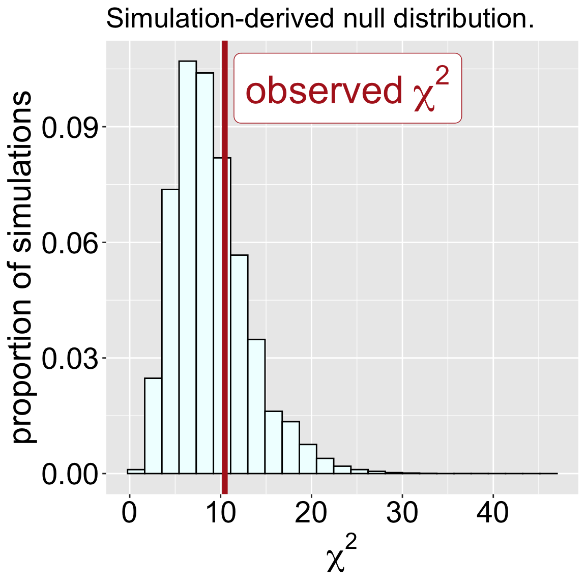 Compared our observed \(\chi^2\) to this simulated null distribution to obtain a p-value and conduct a null hypothesis significance test (NHST). Approximately 29.4% of our null simulation-based \(\chi^2\) values were greater than or equal to our observed value of 10.46. Because the \(\chi^2\) encompasses all types of deviations from null expectations, this is one-tailed test. Our p-value is 0.294, and we fail to reject the null hypothesis.