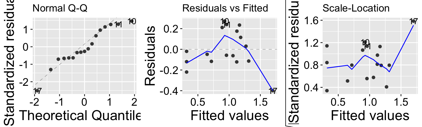 Figure @ref(fig:diaglinreg) shows that the assumptions appear to be met, with the caveat that the observed value of the largest prediction, \(Y_{17} = 1.3\), is substantially smaller than its predicted value, \(\widehat{Y_{17}} = 1.70\).