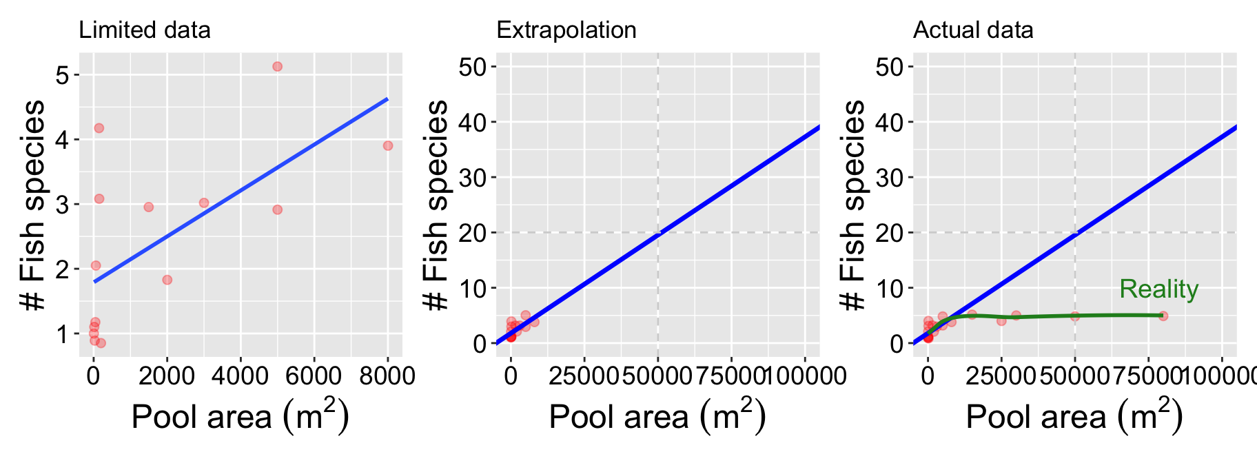 Extrapolating this model to predict species in a 50,000 (m^2) pool, we estimate about 20 fish species (Figure @ref(fig:dontextrap)B). However, additional data shows this is a poor prediction for larger pools (Figure @ref(fig:dontextrap)C).