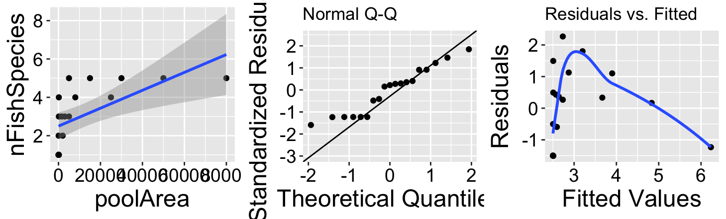 The raw data plot (Figure @ref(fig:fullfpooldatlin)A) shows a strong association between pool area and the number of fish species, with a substantial amount of variance explained (0.39), but diagnostics reveal that small values are too large and large values are too small (Figure @ref(fig:fullfpooldatlin)B,C).