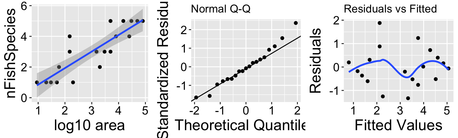 Transforming the x-axis with \(log_{10}\) (Figure @ref(fig:fullfpooldatlog10)A) strengthens the association between \(log_{10}\) pool area and the number of fish species, nearly doubling the variance explained (\(r^2 = 0.74\)). Besides better meeting test assumptions (Figure @ref(fig:fullfpooldatlin)B,C), this transformation represents a more natural model scale.