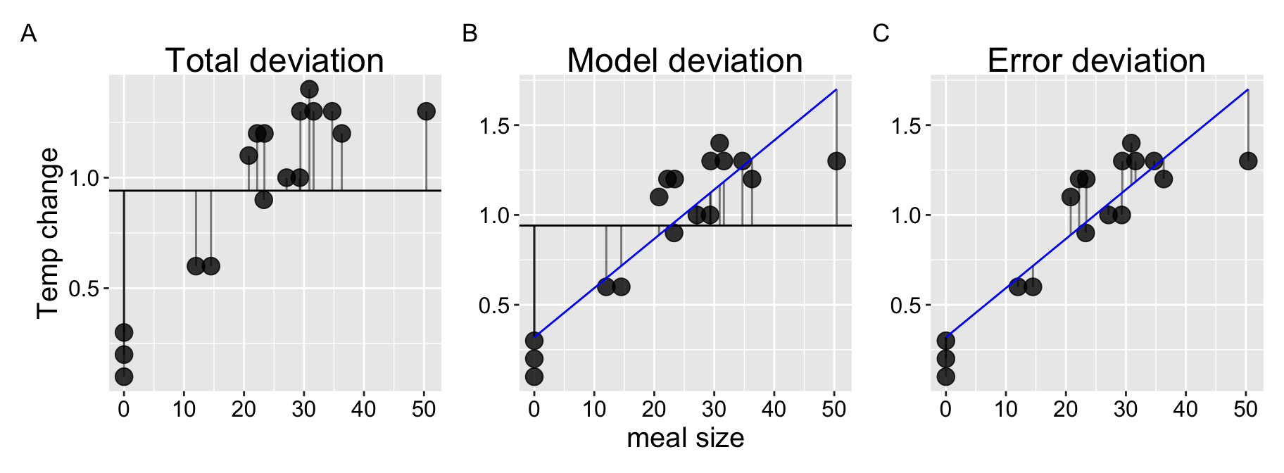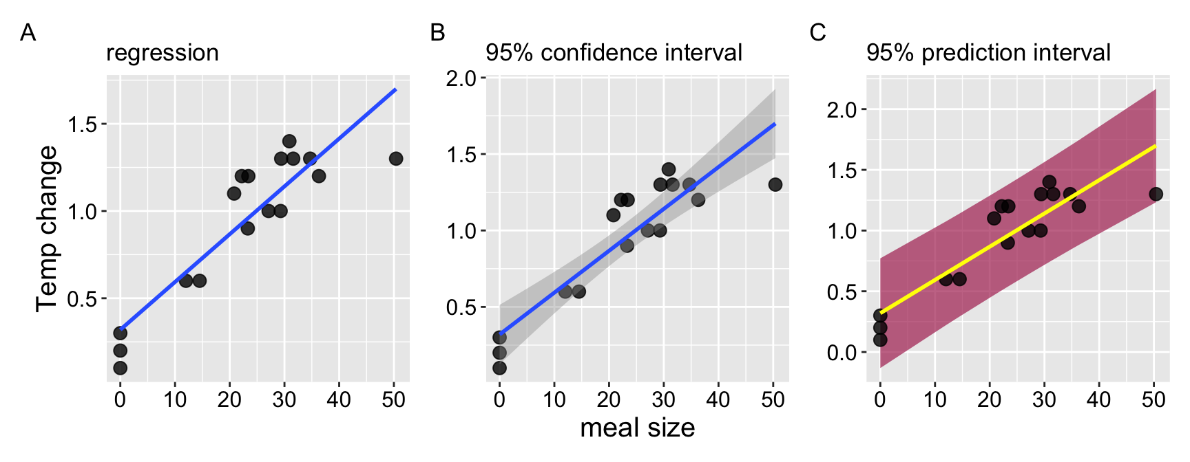 The prey size of the \(X\) axis of Figure @ref(fig:snakeregression)C is in units of percent of a snake’s body weight, and the temperature on the Y axis of Figure @ref(fig:snakeregression)C, is the degrees Celcius increase in a snake’s body temperature two days after eating.