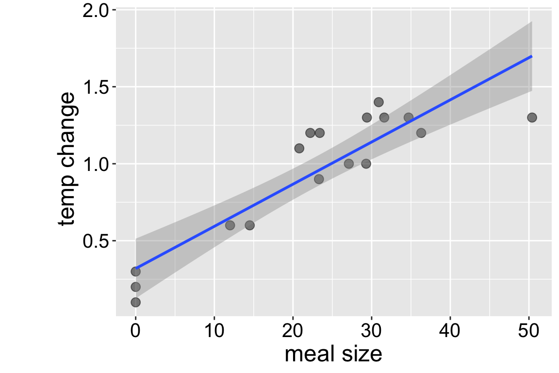 How do snakes heat up when they eat? To find out, Tattersall et al. (2004) noted the temperature of snakes as a function of their prey size (Fig. @ref(fig:snakeregression)).
