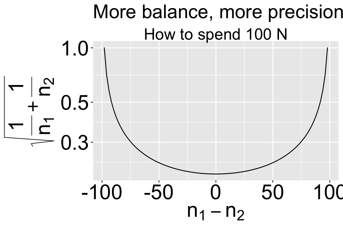 Balanced design Balance refers to the similarity in sample sizes for each treatment. Recall that \(SE_{\overline{Y_1}-\overline{Y}_2} = \sqrt{s_p^2(\frac{1}{n_1}+\frac{1}{n_2})}\). So, for a fixed total sample size, more balanced experiments decrease uncertainty mean differences between treatments.